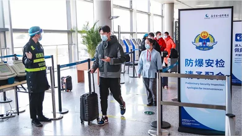 進入航站樓:請全程正確佩戴口罩、出示健康碼綠碼且通過體溫檢測后,可正常通行乘機離港
