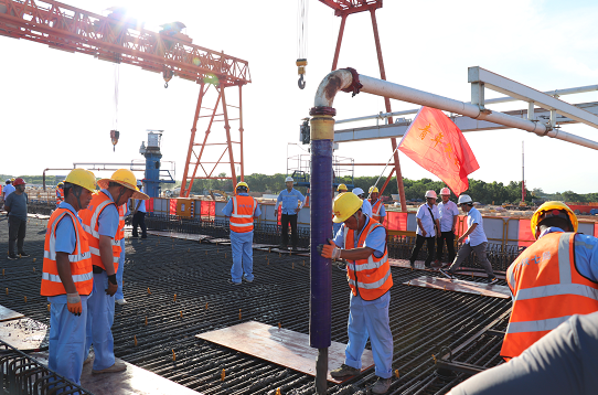 為確保箱梁澆筑順利進行,建設單位廣東鐵投集團所屬廣湛鐵路公司會同中國鐵設總承包項目部,組織施工單位中鐵七局廣湛鐵路八標項目部超前謀劃,在澆筑前組織召開現場施工技術交底會,再次明確澆筑卡控重點和責任分工。首梁澆筑時,項目部投入兩臺布料機,共完成了304.5立方米的混凝土澆筑任務。