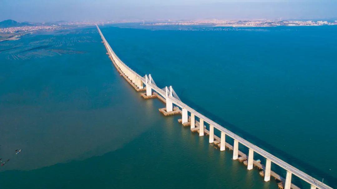 福廈高鐵湄洲灣跨海大橋位于福建省莆田市及泉州市境內,全長14.7公里,其中海域施工長度10.8公里,是國內首座跨海高鐵矮塔斜拉橋。全橋采用CRTS I型雙塊式無砟軌道,設計時速350公里。