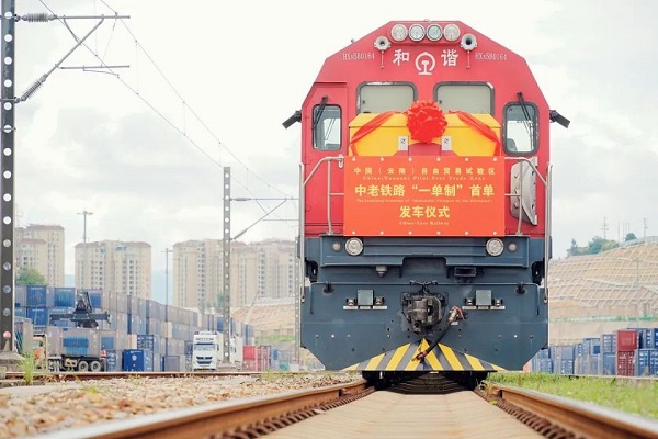 8月30日上午11時(shí),中國(guó)(云南)自由貿(mào)易試驗(yàn)區(qū)中老鐵路“一單制”首單發(fā)車儀式在中鐵聯(lián)集昆明中心站舉行。共計(jì)23車46箱滿載云天化集團(tuán)1200余噸貨值120余萬(wàn)美元(折合人民幣860余萬(wàn)元)貨物的列車從王家營(yíng)西站緩緩駛出。該趟列車同時(shí)也是云投集團(tuán)旗下省國(guó)際班列組織發(fā)運(yùn)的第1000列中老鐵路跨境貨物列車。
