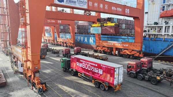 向海圖強、開放發(fā)展。北部灣港從2020年首次超500萬標箱,2021年超600萬標箱,2022年超700萬標箱,到2023年完成800萬標箱,一年實現(xiàn)一次新跨越,這些成績,承載著北部灣港奮斗者的光榮與夢想,凝聚著他們的心血和汗水,是西部陸海新通道發(fā)展的重要縮影。