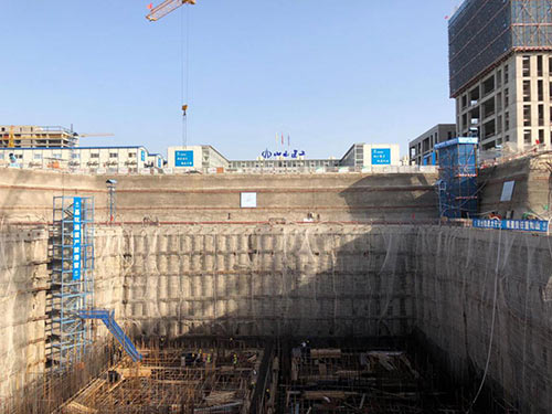 項目部克服了地下水位高、基坑深度大、支護難度大的難題,首次將樁錨支護體系運用到超深基坑的施工中,大大節約了工期和造價。在地下結構施工期間又經歷了地下空間狹小、降排水控制難、物資吊運難、鋼筋密集、結構構件截面大、懸挑結構多等困難。夏季天氣炎熱,連續十幾天的40℃高溫天氣,項目管理人員陪同施工人員一起,盡可能的增加夜間工作時間,為完成施工內容加班加點。雨期降水連綿,基坑內作業難度大,對支護結構的影響更大,為預防雨水帶來的各項安全隱患,項目設置了上部擋水、側壁防護、坑內疏排的綜合管理措施,保證了施工的安全。針對超大截面墻體的施工,項目人員群策群力,編制了專項施工方案,最終成型效果好、無滲漏。