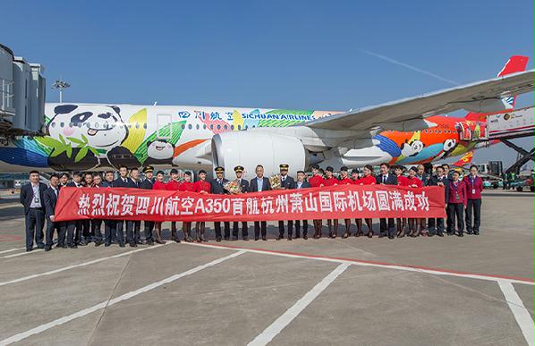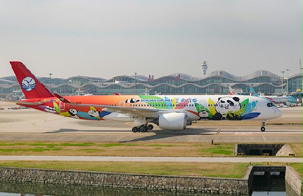 11月24日, 四川航空一架涂裝大熊貓圖案的空客A350-900型客機從杭州蕭山國際機場順利起飛。這是杭州機場首次成功保障該機型飛機,也是空客該飛機在杭州首次亮相,意味著杭州機場民航全機型的保障能力得到進一步提升。