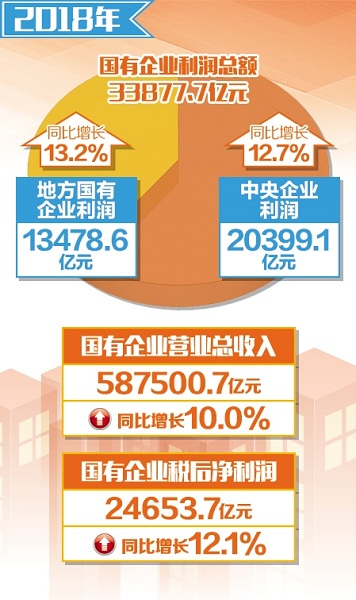 財政部21日發布統計數據顯示,2018年全年,國有企業利潤總額33877.7億元,同比增長12.9%。其中,中央企業20399.1億元,同比增長12.7%;地方國有企業13478.6億元,同比增長13.2%。