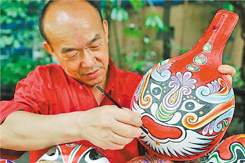 第十五屆文博會(huì)錦繡中華分會(huì)場(chǎng)非遺藝人在制作臉譜面具。