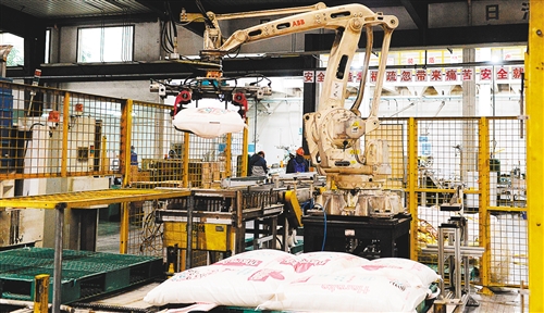 中糧米業(巢湖)有限公司的自動碼垛機器人在生產線上作業。