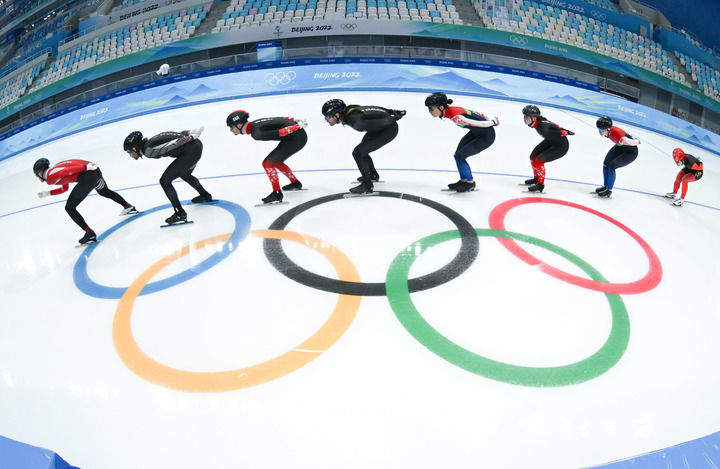 2月18日,參加北京冬奧會速度滑冰集體出發項目比賽的運動員們在國家速滑館“冰絲帶”進行賽前訓練。(新華社記者 武巍 攝)