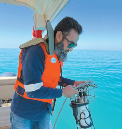 在中國港灣工程有限公司承建的沙特阿拉伯紅海開發項目中,工作人員使用水質檢測浮標傳感器對施工區域內水質進行監測。