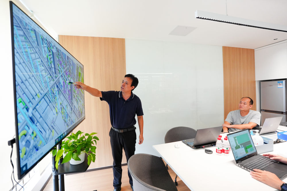 2024年8月26日,中國(guó)電子院工作人員在討論某先進(jìn)半導(dǎo)體項(xiàng)目物流仿真方案