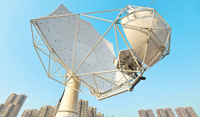 2月6日下午3時,河北石家莊中國電子科技集團公司第五十四研究所(中國電科54所)工程現場,在眾多記者的見證下,通體白色、約7層樓高的巨型反射面天線啟動了,它龐大的巨型“身軀”開始緩緩轉動,既可以完成俯仰15°和90°區間,又可以完成左右270°的旋轉。