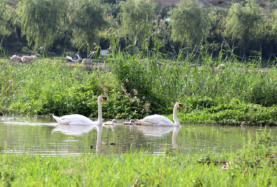 天鵝對水質要求較高,污染太大水下不會有它們需要的食物,就不會留下來。賈魯河高新惠濟項目職工劉益成回憶說,大概是今年1月份,兩只疣鼻天鵝落戶賈魯河,并長居于此,于5月初產下7只萌寶小天鵝。綠水盈盈,波光粼粼,9只天鵝在水里歡快地嬉戲。疣鼻天鵝是天鵝屬的一種大型游禽,全身羽毛潔白,脖頸細長,前額有一塊瘤疣的突起并因此得名。