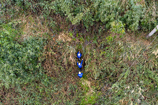 到了目的地,一行三人先趟過山下的一條河,沒走幾步,群山便將他們“淹沒”。山上多是密不透風的茂林野竹,他們先用鋒利的劈刀開路。因山勢太陡,再加地面潮濕,稍不小心就會滑倒,有時還會被帶刺的荊棘扎傷。下山時,為了節省力氣,他們會像滑滑梯一樣直接滑下去……