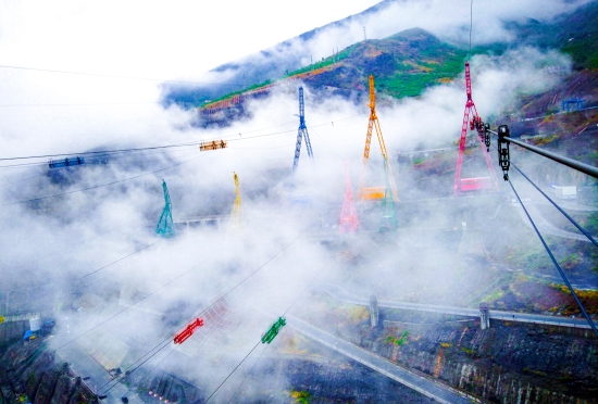 “它是七臺由彩虹顏色標識的纜機組成,尤其是起霧天氣,云霧環繞著它,充滿了詩情畫意,是白鶴灘工地一道別樣的風景。”