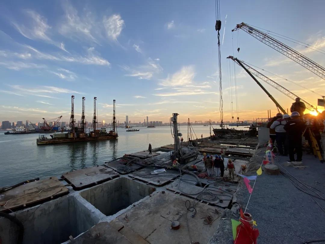 連續(xù)熬夜作戰(zhàn)的組員們疲憊不堪,可沒人顧得上休息,迅速開展排查。原來,沉箱底部企口處由于黏連混凝土過多,被卡住無法動(dòng)彈。考慮到企口卡住的位置距離陸域很近,大家決定使用功率最強(qiáng)的旋挖鉆施工。待混凝土清理徹底后,沉箱終于具備起浮條件。