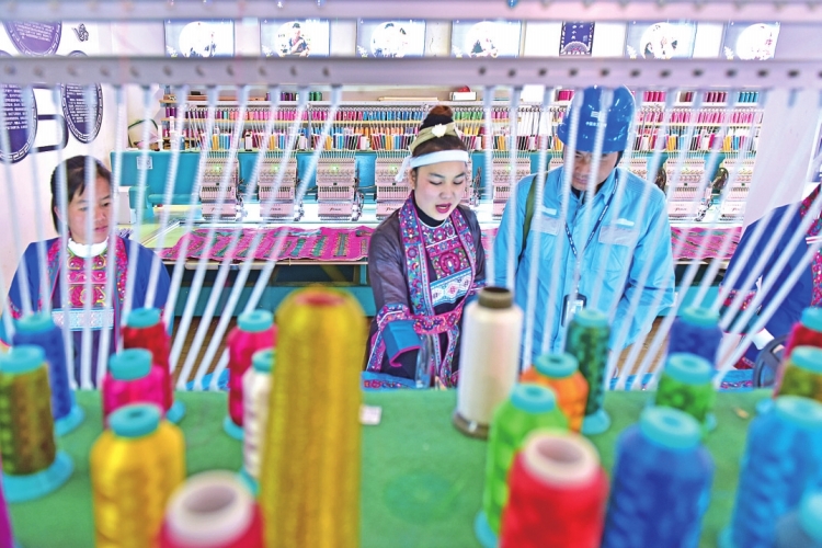 覃桂珍(中)大學(xué)畢業(yè)后回鄉(xiāng)自己開了一個扶貧車間,為118個貧困繡娘提供就業(yè)崗位