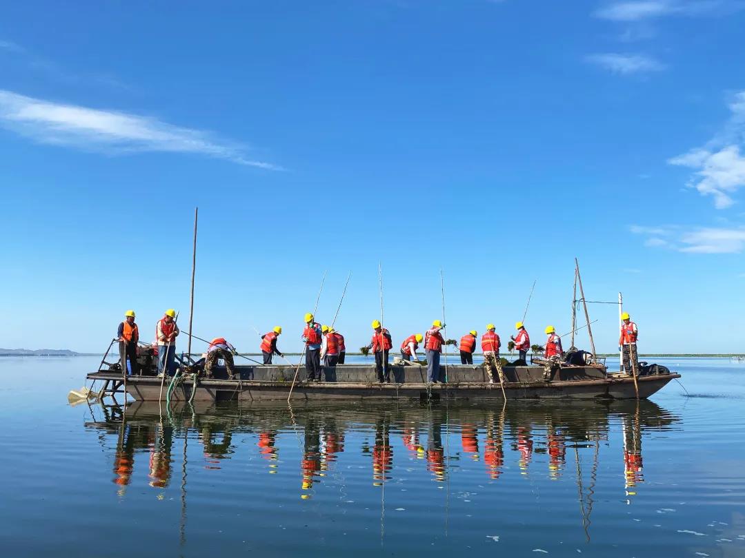 一次偶然的發現,讓項目部如獲至寶。那天的烏梁素海,風和日麗,候鳥成群從楊波搭乘的小船經過,他看到其中一只鳥兒叼著一只小魚。正是這次偶然,讓項目部確定了“水草減量化+生物控草技術”的可行性。“通過全自動機械割草船在一定時期內‘干凈徹底’地削減湖區內源污染物質,結合生物控草技術投放草食性魚類,充分利用草魚‘啃青食尖’的食性控制水草的生物量,借助食物鏈的力量,達到水草減量的目的。”楊波介紹說。
