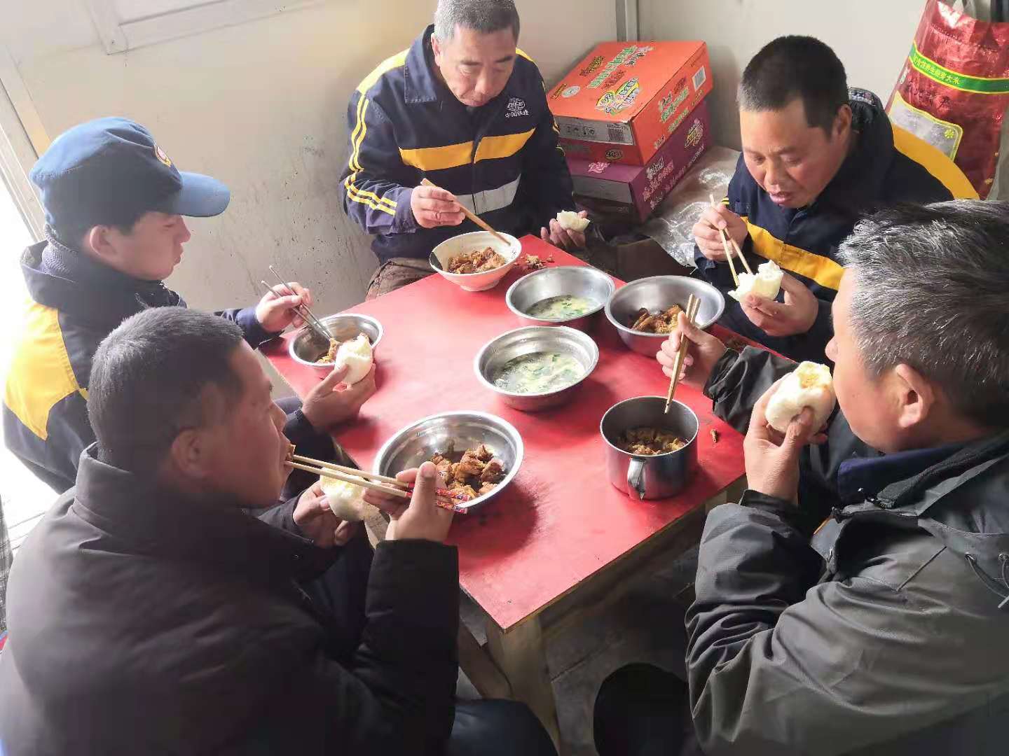 “中午炒兩個菜,早上、晚上就簡單煮個面條。夜里值班要是餓了的話,就吃個泡面。”午飯時間,擅長廚藝的老大哥趙漢增負責掌勺,其他工友則分工合作,洗菜、切菜、發電、熬粥……不一會兒,兩菜一湯上桌,大家圍坐在一起享用起來。