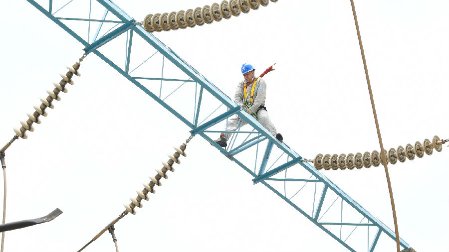 龍福剛使用自己改良過的安全工具器,在桿塔上開展輸電線路檢修維護工作。(盧關文 攝)