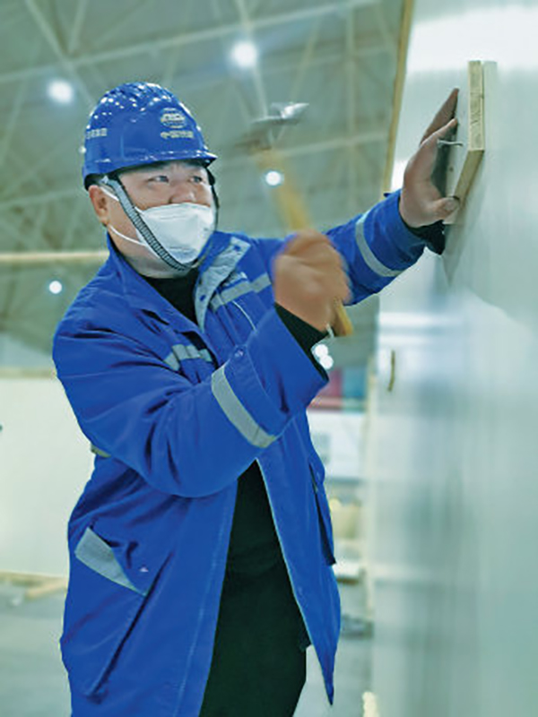 沈業(yè)伍在武漢客廳“方艙醫(yī)院”搶建中進(jìn)行隔板安裝。張路軍 攝