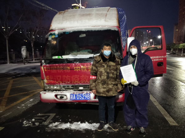 2月15日夜,孟鵬飛(左一)接收中國鐵物雪夜馳援的酒精、口罩等防疫物資