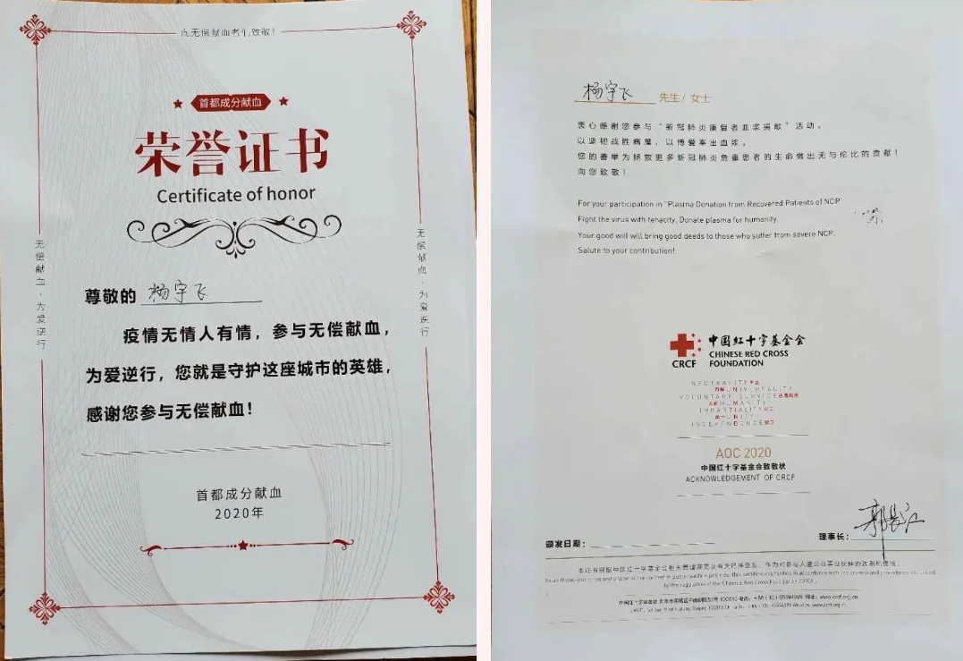 楊宇飛自愿捐獻(xiàn)血漿獲得的榮譽證書