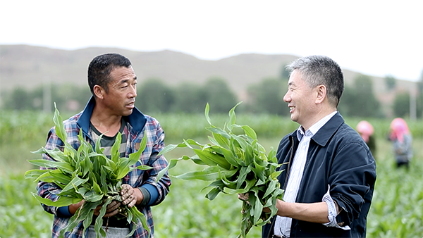 孫潔(右)在無公害雜糧供應(yīng)基地和尚義鄉(xiāng)親一起勞動(dòng)
