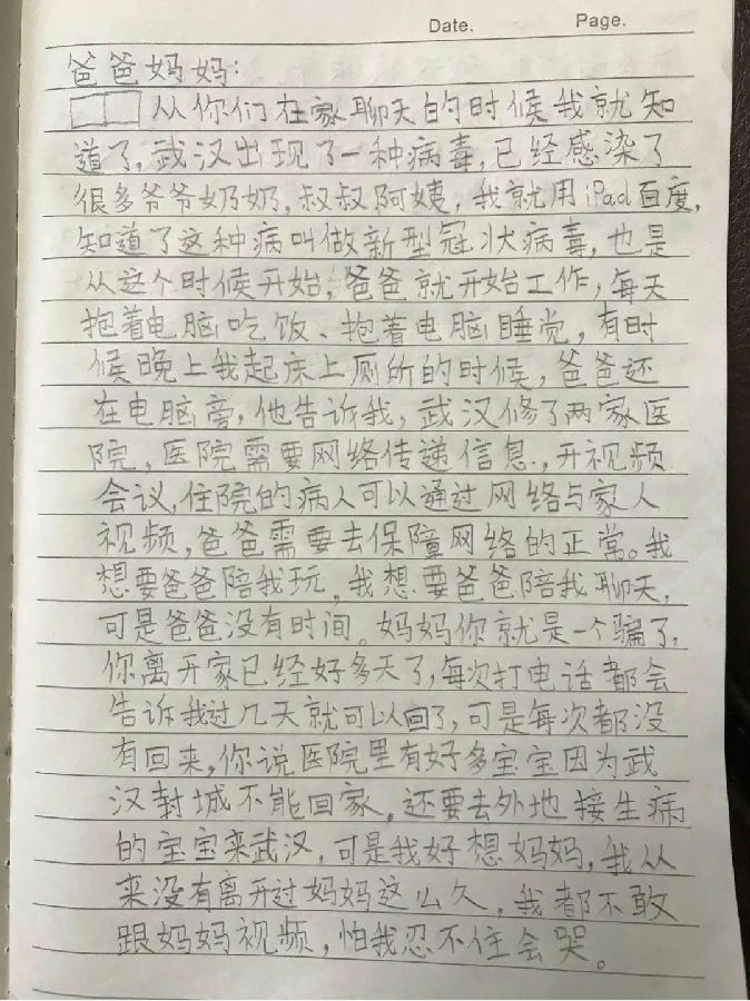“媽媽你就是一個騙子,你離開家已經好多天了,每次打電話都會告訴我過幾天就可以回了,可是每次都沒有回來,你說醫院里有好多寶寶因為封城不能回家,還要去外地接生病的寶寶來武漢,可是我好想媽媽,我從沒有離開過媽媽這么久,我都不敢跟媽媽視頻,怕我忍不住會哭。爸爸告訴我,武漢很快就會好起來的。爸爸媽媽,你們放心,我會自己看書,好好學習,長大后做一個有用的人。”