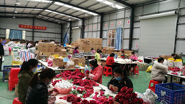 同時,扶貧車間還大力推廣外發生產,將半成品集中到村里的外發點,由農戶們利用閑余時間手工完成最后一道工序。村民們可以一邊干家務和農活,一邊兼顧仿真花的組裝工作,通過“外發生產”實現在家門口務工的愿望。