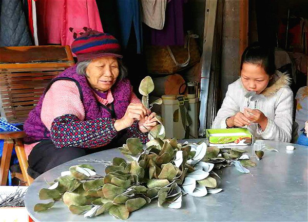 蒙阿婆和尚未開學的小孫女一起在家制作仿真花