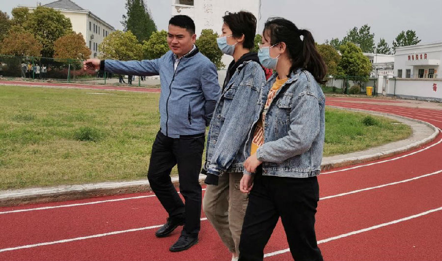 陶三寶在梨樹學校新建成的塑膠跑道上與學校師生交流