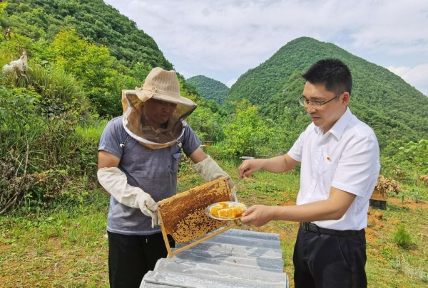 孟夏時節,嚴召波與洛麥村“斷指”養蜂人張小強一起收集100箱蜂箱的蜂蜜。(譚鎮林 攝)