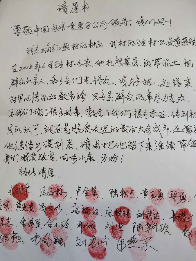 2020年4月9日,中國(guó)電信廣西金秀分公司收到一封來(lái)自金秀縣三角鄉(xiāng)江燕村村民的請(qǐng)?jiān)笗?shū),請(qǐng)?jiān)笗?shū)結(jié)尾是24位村民按有紅色手指印的簽名。當(dāng)江燕村村民得知電信公司擬對(duì)駐村扶貧隊(duì)員黃燕航進(jìn)行調(diào)整的消息,他們商討后決定給電信公司寫(xiě)一封請(qǐng)?jiān)笗?shū)將黃燕航留下來(lái),繼續(xù)支持江燕村的脫貧攻堅(jiān)工作。這是一封對(duì)派駐江燕村駐村扶貧隊(duì)員黃燕航高度贊揚(yáng)的請(qǐng)?jiān)笗?shū),更是對(duì)中國(guó)電信扶貧工作的認(rèn)可和肯定。