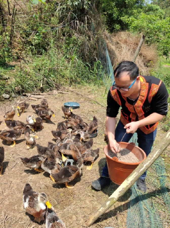 黃燕航幫助貧困戶(hù)喂養(yǎng)盤(pán)王土鴨