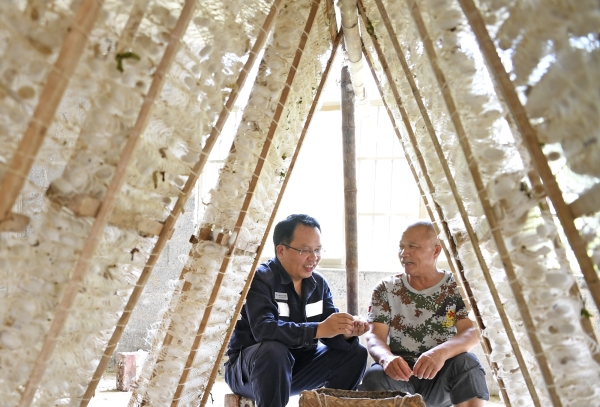 丁特強與覃浪村種桑養蠶致富能手韋林豐交流學習養殖技術。 (馬華斌 攝)
