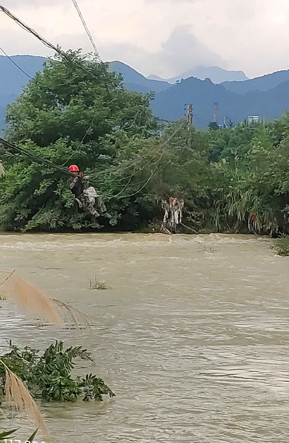 洪水已經把空中連接纜線的那根鋼索壓壞,纜線的中間部分已經下墜,成了離河面最近的點。腳下面流過的河水嘩嘩作響,聲音大得連對講機里的聲音也被蓋住,李翔只能告訴心里默念:“不要往下看?!睔v時兩個多小時,他終于完成了纜線連接。