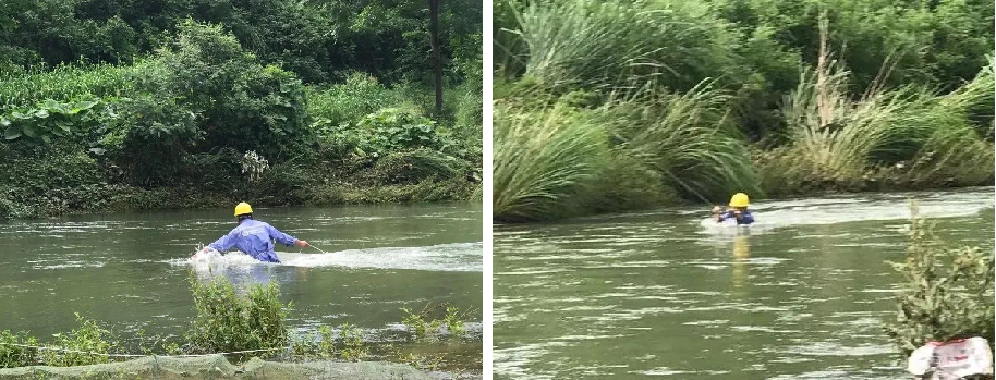 在團河鎮(zhèn)官舟村,為搶修跨河光纜中間的故障點,楊俊躍脫下鞋襪及長褲,在腰上綁上繩子,緩緩地走入河中。湍急而冰涼的河水逐漸沒過了楊師傅的脖子,他到達對岸后將重新敷設的光纜泅渡牽引過來,最終順利完成了搶修任務。