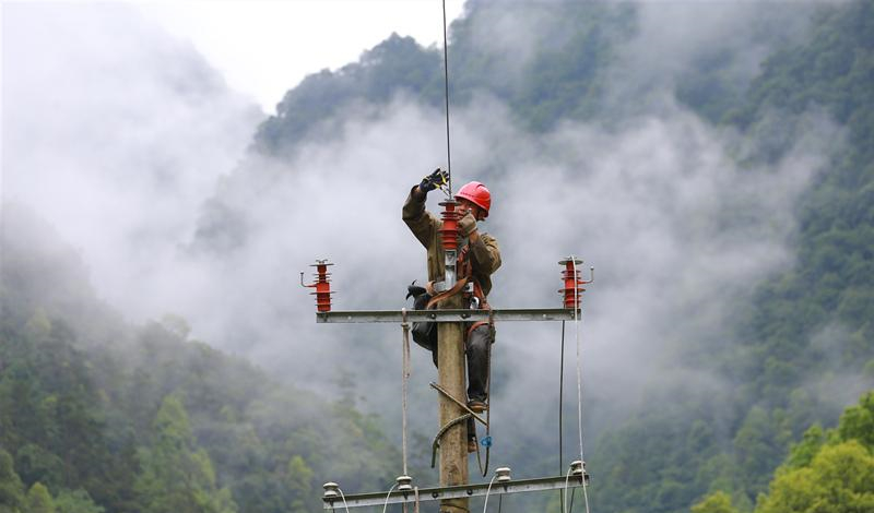 “這幾個電工在桿子上淋了幾個鐘頭的雨,喊他們下來躲雨都不下來!”作業點附近的村民楊紹蘭很心疼這些“電騾子”。