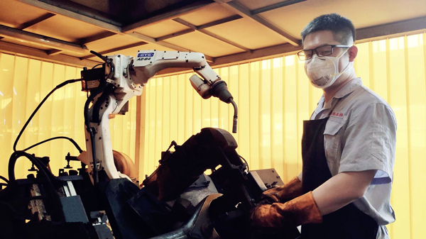 提到焊接,人們或許首先想到的是火花四濺、云霧繚繞,尤其夏季,汗流浹背是家常便飯。工作苦、環(huán)境差,這些并不能阻擋龐聰對這項工作探求的渴望,在他眼里,焊接機(jī)器人崗位簡直就是個“寶藏”:它不僅糅合了數(shù)控編程和焊接技藝,而且對操作員的觀察力、辨別力、責(zé)任心以及經(jīng)驗儲備都提出了很高的要求,對年輕員工鍛煉價值很大。