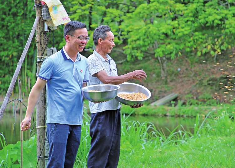 劉建強(左)與村民李細弟一起喂魚(方虹 攝)