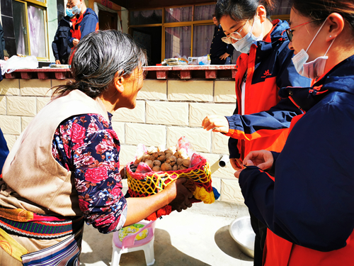 2020年5月4日一大早,嘎堆黨支部?jī)H有的十余名職工又開始像往年一樣忙碌起來,收拾著大家自行購買的“禮品”,準(zhǔn)備前往海拔3800米的西藏加查縣冷達(dá)鄉(xiāng)。車沿著蜿蜒的山路前行,大山深處,藍(lán)天白云綠色掩蓋之下,道路兩側(cè)彩色經(jīng)幡迎風(fēng)飛舞,這條扶貧之路今年已經(jīng)是第三年。
