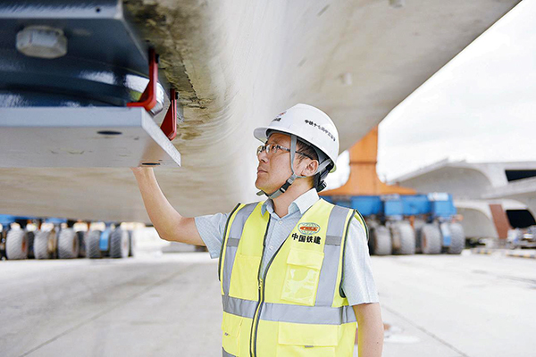 袁川貴在檢查箱梁支座安裝質量(段文婷 攝)
