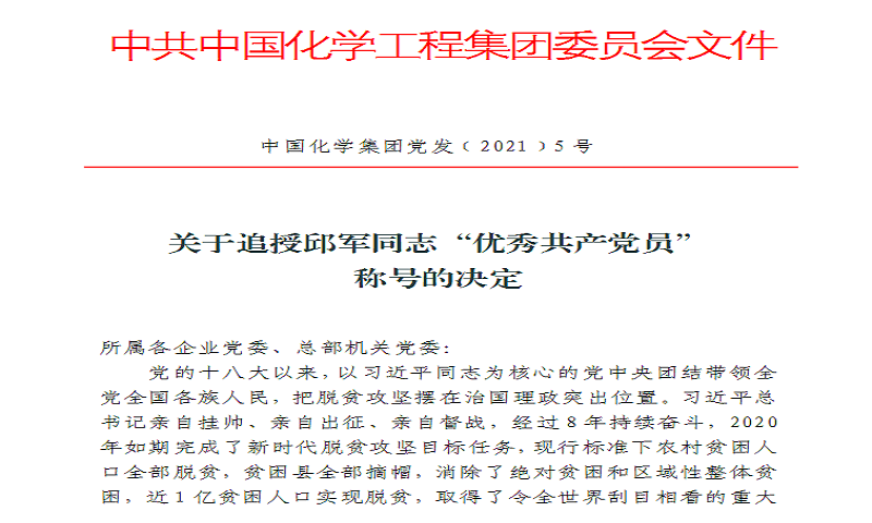 中國化學工程黨委決定追授邱軍同志“中國化學工程集團有限公司優秀共產黨員”稱號,并號召全體黨員干部、職工群眾,學習邱軍理想信念堅定、對黨無限忠誠的政治品格;學習邱軍扎根基層、無私奉獻的價值追求;學習邱軍踐行宗旨、赤誠為民的精神境界;學習邱軍腳踏實地、務實創新的工作作風。