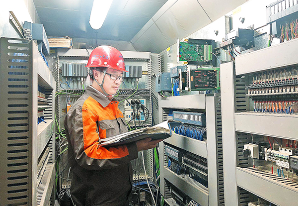 蔡文輝在對盾構(gòu)機(jī)進(jìn)行電氣檢修(孫兆偉 攝)