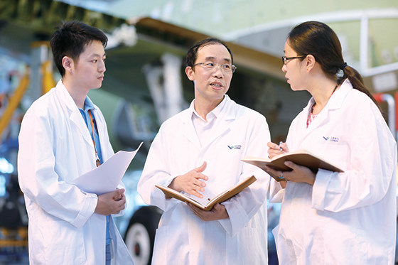 周良道(上圖中)是負責C919大型客機結構、強度的副總設計師。遇事兒喜歡“刨根問底”,知其然知其所以然,是周良道的習慣。“干我們這行常常遇到難題,要抽絲剝繭,找到問題的‘根’,事情就好解決了。” 周良道說。