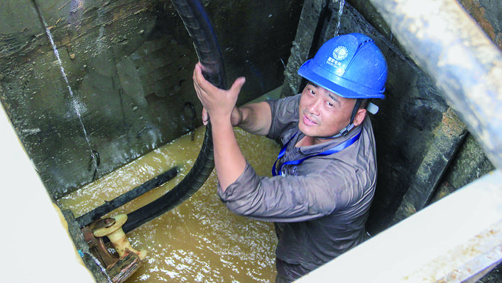 7月26日,湖北武漢江夏區供電公司員工黃威在江夏區花山郡小區豎井里敷設電纜
