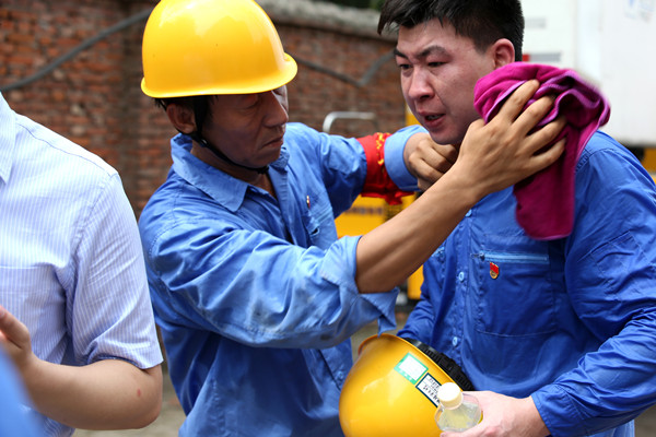 河北石家莊供電公司帶電作業班班長張全勝為剛作業完的工作人員擦拭汗水。