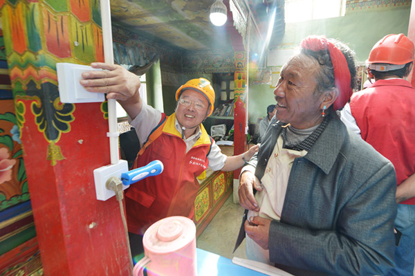 2018年6月,錢海軍率志愿者前往西藏仁布縣開展“千戶萬燈”公益項目。圖為錢海軍為當?shù)卮迕裥蘩砑抑械碾姛?/font>