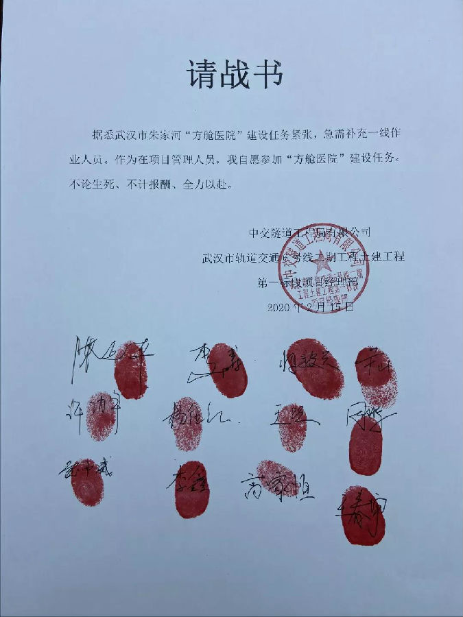 80后項(xiàng)目經(jīng)理、黨員陳延平立即召開(kāi)全體人員會(huì)議,“特殊時(shí)期,大家已連續(xù)奮戰(zhàn)多天,但‘前線’急需支援,項(xiàng)目成立青年突擊隊(duì),自愿報(bào)名,我是黨員,我報(bào)名。”“我是黨員,我先上!”青年黨員王春宇第一個(gè)請(qǐng)戰(zhàn),不到5分鐘,由12名平均年齡不到30歲青年人組成的突擊隊(duì)組建完成。出征前,突擊隊(duì)員立下《請(qǐng)戰(zhàn)書》:我自愿參加“方艙醫(yī)院”建設(shè)任務(wù),不論生死,不計(jì)報(bào)酬、全力以赴,請(qǐng)戰(zhàn)書上12個(gè)親筆簽名和鮮紅指印,見(jiàn)證著隊(duì)員們的青春擔(dān)當(dāng)和必勝?zèng)Q心。