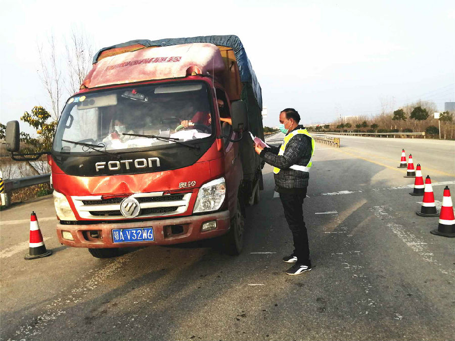 周潮俊在防控卡點(diǎn)對(duì)往來車輛和人員進(jìn)行查驗(yàn)