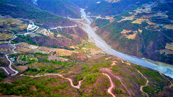 該項目征地拆遷負責人陳維介紹,他們當初修建施工便道時,可借用的鄉村道路十分有限,其中有80%都要重新開辟。頭上一頂遮陽草帽,一手拄著登山杖,一手拿著打蛇棍,背包里裝著一天的干糧、泡面和水,靠著一雙腿爬坡上山、穿梭密林,成了踏勘隊員當時的行軍標配。后來,碧溪鄉政府為紀念他們對地方交通作出的突出貢獻,將新修建的10公里長沿江公路命名為“昌盛路”。